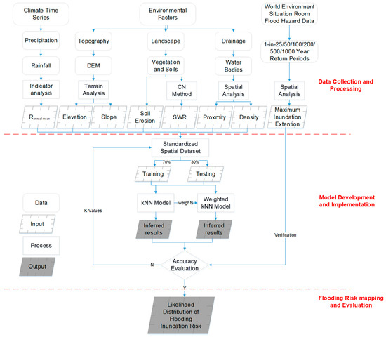 Conceptual framework of WkNN, which includes data collection, processing, model construction, validation, accuracy evaluation, and flood risk mapping.