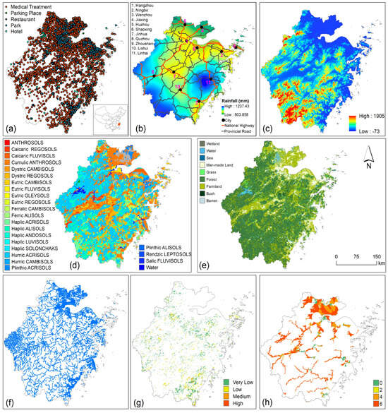 Spatial distribution of collected data. (a) Various tourism facilities including parks and hotels, (b) mean annual rainfall (1951–2007) over 11 cities and two main levels of roads, (c) Digital Elevation Model at 30 m resolution, (d) soil types and contents, (e) land use and land cover, (f) drainage system, (g) soil erosion, and (h) 1-in-50 YRP example of various flood year return period.