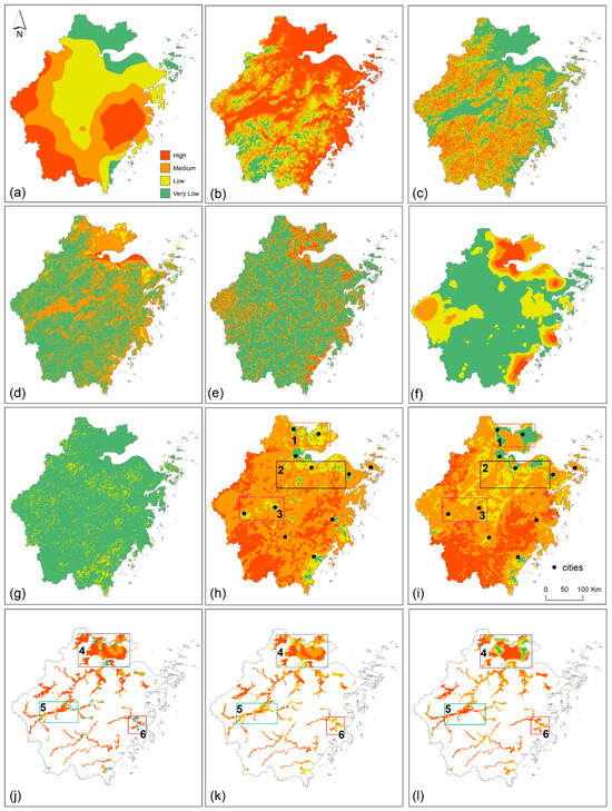 In the northern area, there is also a high-risk area under lower evaluation. Most areas are covered by medium risk in flood inundation, which is larger than high risk, since compared with medium flood risk, high flood risk rarely happens, unless there are extraordinary climate events and fragile environments, such as extreme rainfall and bare ground. A medium risk is mutually affected by multiple factors over the center area. Elevation (152.55 km2) and precipitation (76.84 km2) contribute greatly to the central part across the west to the east. In the fringe of the study area, medium risk is mainly affected by the drainage density and proximity. The high-medium area demonstrates that elevation and precipitation are the two extremely important factors for the FIR. Slope, erosion, and proximity make similar contributions to high-medium risk since their areas are 32.77 km2 and 73.45 km2 in high risk and medium risk, separately. The river density and SWR have little contribution to high-medium FIR. Based on prior experience [49], a high density of rivers or areas nearer to the rivers should have high or medium flood risks, but actually, these areas have low or very low flood risks in the study. This is mainly because drainage systems carry more flood into the sea and mitigate the stress of flood inundation pressure in the study area. Also, larger cities, such as Hangzhou, are mainly located in low-risk or very-low-risk areas, which vividly demonstrates that man-made water conservancy facilities play a huge role in protecting socioeconomic development and alleviating flood risk.