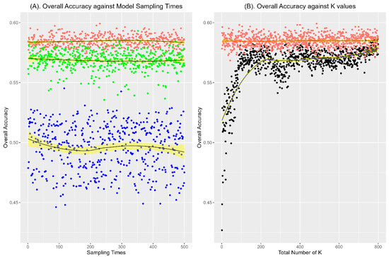 This study explored the relationship between sampling times and the tendency of EA under values. The overall accuracy (OA) was chosen to evaluate the performances of kNN and WNN against the MIE. The OA denotes the proportion of correct predictions made by models or systems over the total number of predictions [67,68], which can directly reflect the EA, and it is easy to understand and use. Figure 4A shows that the larger the k value, the higher the OA accuracy since the EA curve distribution of blue points ( = 5) is significantly lower than the EA curve distribution of green points ( = 95). The 5 and 95 values were selected randomly and are roughly equal to the square root of the training datasets, respectively (8947) [38]. Under different sampling times (from 1 to 500), the range of both OAs (in blue and green) is relatively larger, which shows that the kNN method is unstable. However, compared with kNN, the WkNN method (in red) shows comparative robustness since the OA range of the WkNN model is aggregated around the medium value (about 0.58) when taking the same values ( = 5 and = 95), which additionally demonstrates that the predicted performance of WkNN is higher than that of kNN.
