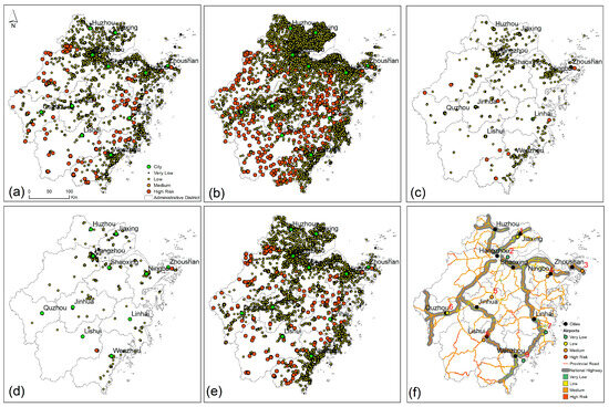 Figure 5 shows the tourism facilities that are exposed in the predicted FIR. To highlight tourism facilities with high-medium risk levels, the facilities with higher risk levels will have bigger point sizes. This illustrates that in most inland areas, some tourism facilities are located in high-medium-risk areas of flood inundation, especially hotels (Figure 5a), medical treatment institutions (Figure 5b), and restaurants (Figure 5e). This is because high-risk areas are often scenic and attractive due to their proximity to water bodies, such as rivers, lakes, or the ocean. Some flood-prone areas may have historical or cultural significance, such as old towns or heritage sites. All of these factors determine that the number of medical treatment institutions is higher than other facilities in high-risk areas for responding to disaster relief and rescue. Therefore, it can easily be understood that medical facilities in high-risk areas will play key roles in effectively mitigating or even preventing the negative impact of flood inundation on tourism facilities and in saving lives. Additionally, parks (Figure 5c) and parking places (Figure 5d) are mainly located in low-risk or very-low-risk areas since most of them are in urban areas. Additionally, the study area has a wonderful road system (Figure 5f) at the national-provincial levels. The majority of roads are located in medium- or low-risk areas of flood inundation, which not only helps to develop tourism resources but also helps to efficiently carry out disaster relief and post-disaster reconstruction.