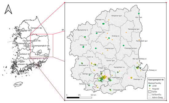 According to the South Korean National Geographic Information Institute [12], the study area, Gyeongsangbuk-do, is identified as the most challenging province in terms of providing emergency healthcare service coverage to the population of older adults (+65) due to the significant spatial disparity in the distribution of LEMIs. In this province, only 69.15% of the population resides within 10 km (~30 min of travel time) of any emergency medical center, including LEMIs. This represents the lowest ratio among the nine provinces of the country, with an overall mean of 73.26%. Given this context, this area represents a good study area for exploring effective planning scenarios for optimizing the placement of LEMIs. There is a sizeable body of research regarding assessing the distribution of EMS facilities in the context of South Korea [10]. However, a majority of the studies focused on assessing EMS coverage to identify underserved areas regarding medical services. From a methodological perspective, the models they employed were network-based indicators, such as accessibility measures with descriptive statistics. The policy implications in their conclusions, therefore, did not explicitly address substantial solutions for resolving the disparity issues in healthcare access from a planning perspective.