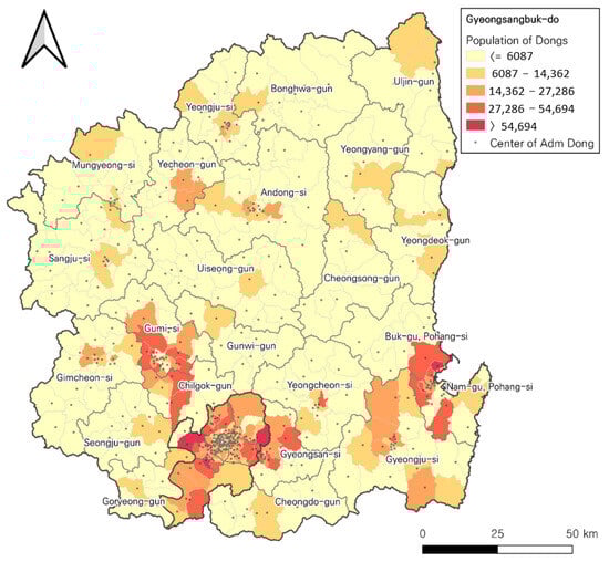 Figure 2 displays the spatial pattern of the population of 468 Dongs and their representative demand areas. It is noticeable that the administrative offices of the Dongs are significantly concentrated in three major cities (>50,000 residents): Daegu-si in the south, Pohang-si in the southeast, and Gumi-si in the west, indicating a significant discrepancy in population distribution compared to the Dongs. Most other areas where the majority of cities are rural have populations of less than 6000.