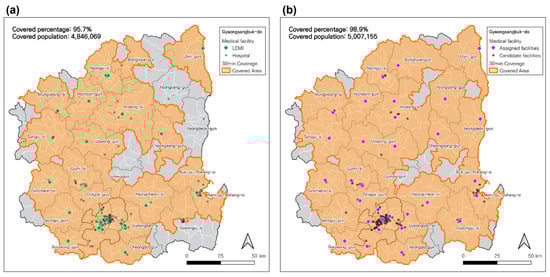It is important to define a standard for the maximal service range of EMS facilities to evaluate the effectiveness of the EMS planning scenarios. However, there is little consensus in the literature regarding how to define the geographic coverage for primary EMS facilities [4,23]. In our study, the service coverage standard for LEMIs is defined based on the street-network-based travel time from a LEMI to demand areas, which is a 30 min street-network-based travel time distance as the threshold for emergency service coverage for a LEMI, which is generally accepted for the geographic scale of the study area in South Korea [43,44]. As a measure of the weighted demand, we utilized the population size at each Dong (~town, total 468 Dongs in the study area), the standard administrative district for our case study. By employing this criterion, the percentage of the population covered by each LEMI is calculated based on the results from the p-DIME model.
