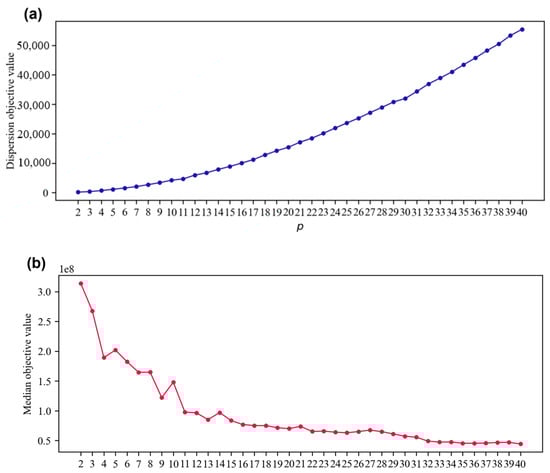 Change in two objective values of the p-DIME model with p. (a) Change in the objective function values on the maxisum dispersion terms (locations). (b) Change in the objective function values on the median terms (allocations).