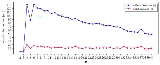 To examine the effectiveness of the APRIL constraint, Table 2 presents computational results comparing the solving performance between the standard p-DIME model (A) and the model with APRIL (B). As mentioned in the previous section, the APRIL constraint was included in the model by obtaining the optimal objective value of the (p – 1)th maxisum dispersion model. As shown in the second column in Table 2, both models produced identical objective values for all instances. However, the model with the APRIL constraint significantly reduced the solution time, with a reduction rate ranging from 50% to 88.9%. It is worth noting that the solution times of the p-DIME model with APRIL consistently remain low, taking less than 20 s for all p (see Figure 5). In contrast, the p-DIME model without APRIL exhibits greater variability in finding optimal solutions (~130 s). This consistently low variability, regardless of the value of p, indicates that the treatment using the APRIL constraint is promising for large instances, although the model is in the class of NP-hard. In other words, if solving an instance at a certain p is difficult to solve the problem with optimality, employing a sequential solution procedure (p = 1, 2, …, p − 2, p − 1) can serve as an alternative and effective solution approach.