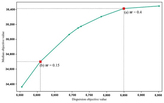 Trade-off between dispersion and median of LEMIs in the p-DIME model (p = 31). Note: for a better visualization of Pareto curve, the population-weighted demand values are rescaled by 1/10,000 [45].