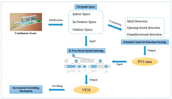 The construction procedure of VESI primarily encompasses viewpoint space subdivision, potential visual set detection strategy, spatial index establishment, and matching incremental data scheduling mechanism. The relationships among each component is illustrated in Figure 2.