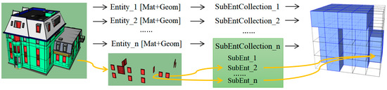 Regarding interior entity reorganization, entities originally organized according to “material + geometry” are transformed into entities organized based on spatial positional relationships. In Figure 3, the diagram is sequentially divided into four sections from left to right in accordance with the depicted arrows, and the leftmost section represents the unaltered 3D model. The second part implies that the initial model typically relies on model materials to organize entity data, where all red windows in the diagram are designated as one entity. In the third part, the red material entity (windows) is divided into multiple sub-entities based on the spatial connectivity of the triangular surface, resulting in the acquisition of several independently operable windows. In the fourth section, we partition the entire building space into grids, creating multiple smaller blue spaces, and subsequently consolidate all sub-entities within each blue space into a single entity. In this process, the value is used to impose an upper limit on the number of triangular surfaces generated after each object reorganization, thereby ensuring that excessive triangular surfaces are avoided for each individual object.