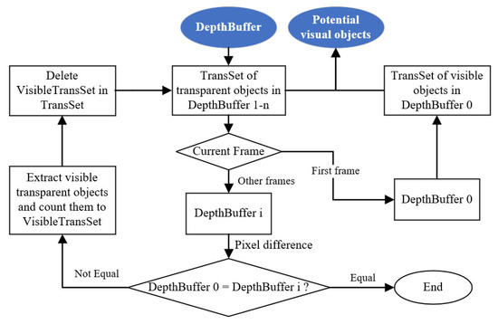 To obtain a comprehensive collection of visible objects in a specific direction, we leverage the depth map cache within the graphics rendering pipeline. However, due to the inherent characteristics of this pipeline, transparent objects such as glass are erroneously treated as obstructive entities, leading to an omission of objects located behind them in the depth cache map. Consequently, this paper proposes a novel multi-frame recovery algorithm aimed at achieving precise extraction of the visible set. A depth cache map is generated in every frame, capturing the color and unique identity of each pixel as . Thus, . By traversing the set and eliminating duplicate ObjectIDs, we obtain the , which represents the remaining visual collection. Building upon this foundation, a multi-frame restoration process (Figure 5) is used to further extract visible transparent objects. The specific process involves: