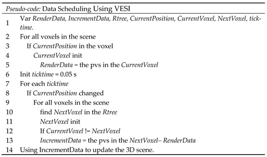The pseudo-code in Figure 7 formulates the scheduling process using VESI. Firstly, the system reads the VESI file to input the information in the 3D scene into memory. This information comprises a set of VS voxels and an R-tree pertaining to VS voxels. Then, the 3D scene walkthrough operation and data loading are performed. This includes determining the current position of the camera, setting the update interval, checking if a valid movement has occurred within the update interval, and calculating the set of new visible objects after a valid movement. Finally, the new visible object was rendered and visualized.