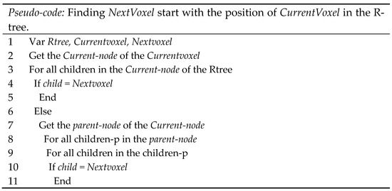 The retrieval of R-trees is accomplished using a highly versatile approach. As illustrated in Figure 8, the pathfinding process from CurrentVoxel to NextVoxel involves a transition between two-layer parent nodes.