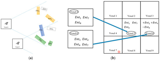 Figure 9 presents a scheduling scenario, where Voxel5 and Voxel6 represent two arbitrary spatial locations. Figure 9a illustrates two VS voxel records of visible objects, wherein the visible objects recorded in Voxel5 include Ent1, Ent7, and Ent8, and those recorded in Voxel6 include Ent1, Ent2, Ent4, Ent7, and Ent8. Figure 9b demonstrates the utilization of an incremental mechanism for processing when transitioning from Voxel5 to Voxel6. Using the VESI retrieval method and comparing the differences in the visible sets between these voxels, Ent2 and Ent4 are added to computer memory while Ent8 is removed. With efficient incremental updates, newly visible objects can be promptly integrated into the rendering pipeline for executing visualization programs.