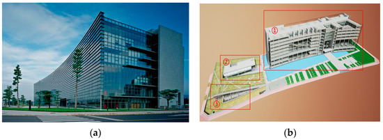 We conducted an experiment using a simulation scene that incorporated three architectural details, both indoor and outdoor spaces. Scene 1-1 accurately replicated the physical environment corresponding to the model, while the implementation of VESI effectively depicted the visualization process during transitions between the indoor and outdoor spaces. The photograph in Figure 10a depicts the current state, where Building 1 in the scene (Figure 10b) will serve as the continuous visualization for both the indoor and outdoor settings during this experiment. We utilized the C++ programming language in conjunction with the fundamental library provided by Unreal Engine 4 to develop a VESI production program and an accompanying visualization platform. The experimental software and hardware environment encompassed Windows 10, an Intel i7 CPU, and 16 GB of memory.
