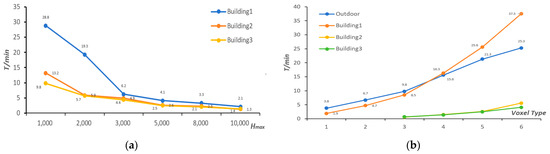 The data preprocessing speed of the three buildings under different values is depicted in Figure 12a. Overall, there is a decreasing trend in processing time as the threshold increases. Notably, for Building 1, setting the threshold to 3000 leads to a significant reduction in pretreatment time. Figure 12b demonstrates the efficiency of view space partitioning and sampling PVS across four regions with varying voxel sizes: Type1 (8 × 4 × 3), Type2 (4 × 4 × 3), Type3 (3 × 3 × 3), Type4 (2 × 2 × 1), Type5 (2 × 1 × 1), and Type6 (1 × 1 × 1). In terms of the outdoor space, the sampling speed of the viewpoint space division tends to stabilize as the grid size decreases. Conversely, for Building 1, there is a sharp increase in sampling time for the viewpoint space division as the grid size decreases. Building 2 and Building 3 exhibit similar simple internal structures, resulting in low processing times for both data preorganization and viewpoint space division sampling.