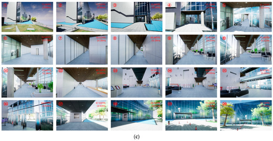 On the roaming path, we displayed 20 relatively distinctive visual locations, and based on them, a statistical analysis was made in the follow-up. Figure 13 shows the scene browsing process along the entire roaming path. Among them, Figure 13a shows the VESI-based test, Figure 13b shows the spatial index-based test, and Figure 13c shows the PVS-based test. The starting point is situated adjacent to Building 2, encompassing an outdoor setting that primarily includes the building shell, the site, and surrounding trees (mainly pic. 1 to 3). Subsequently, access to the interior of Building 1 is attained through the indoor–outdoor transitional area (mainly pic. 4 to 7) of Building 1. Upon entry, an office corridor featuring a guest reception is traversed before reaching the hall (mainly pic. 8 to 14) within the main entrance vicinity. Finally, proceed through the primary entrance of Building 1 is traversed before re-enter the outdoor scene and observing Building 1 within its exterior context (mainly pic. 15 to 20).