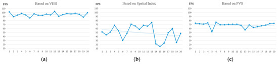 In the PVS-based tests (Figure 14c), the average frame rate was 68.53, indicating relatively smooth visualizations. However, the overall frame rate was lower compared with VESI-based roaming due to the time-consuming process of retrieving PVS collections. Notably, a significant frame rate jitter occurred along the roaming path during testing; specifically, when transitioning from outside into a room (position 4 to position 6), the frame rate dropped from 70 to its lowest point at 52.05 frames per second (fps). This decrease can be attributed to both slow retrieval speed and sudden changes in visible objects.