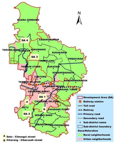 Kurnia et al. [15] distinguished urban and rural neighborhoods in Bekasi Regency in 2015; this study confirms two main urban areas in Bekasi Regency: Cikarang and Tambun. Cikarang is home to seven LSIEPs registered by the Ministry of Industry, while the Tambun urban area is the result of urban expansion from the Bekasi municipality and the Jakarta SCR [15,39]. In 2018, the boundary between Cikarang and Tambun urban areas became borderless, and the desa/kelurahan around both urban areas were transformed into urban neighborhoods (Figure 2). Moreover, urban areas were expanded, leading to DA 2 and 3 (Figure 2), of which DA 3 is designated for agricultural development. Furthermore, there is an expansion of the urban areas that led around primary roads (such as Setu–Cileungsi and Cikarang-Cibarusah streets) and far from the previously formed urban areas/neighborhoods, such as in the Tarumajaya subdistrict, which is close to an LSIEP location (Marunda Center industrial park/estate) [15].
