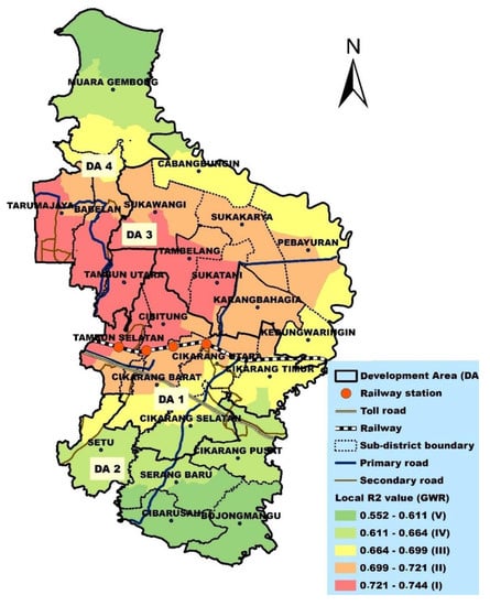 Some studies use OLS and GWR analyses to obtain the determinants/characteristics (globally and locally) in explaining an urban/regional development issue/phenomenon [51,53,54,55]. OLS estimated the effects of predictors on the dependent variable; then, GWR analysis (see Equation (3)) was performed to obtain local determinants/characteristics for urban and rural neighborhoods and the spatial patterns of local R2 in each desa/kelurahan. An R2 value that is close to 1 means that the predictors (x) perfectly explain the issue/phenomenon (predicted variable/y) being studied, while an R2 value that is close to 0 explains the opposite [51,53,54,55].