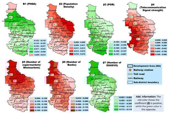 The results of the GWR analysis show that the seven determinants can better explain the characteristics of the urban and rural neighborhoods in the central region, although they are slightly weaker in the northernmost and southeastern parts of Bekasi Regency; this can be seen in the R2 value of the central part ranging from 0.69 to 0.74, while in the northernmost and southeastern parts, it ranged from 0.55 to 0.66 (Figure 3). The central part of Bekasi Regency is the location of numerous LSIEPs, paddy-field areas, and settlements. In contrast, the northernmost part of Bekasi Regency is dominated by mangrove areas and rural settlements, and the southeastern part is a hilly area dominated by mixed plantations and rural settlements [15,39,61]. Furthermore, each explanatory (independent) variable has a different degree or significance (coefficient/β) value for each desa/kelurahan (Figure 4).