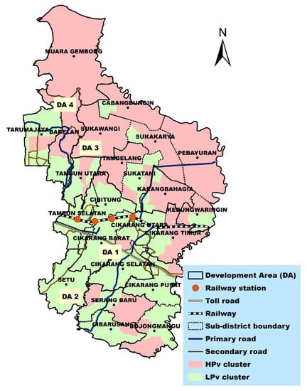 Most rural neighborhoods of the HPv cluster are clustered in the northern part of Bekasi Regency, particularly in DA 3 (Figure 8). All subdistricts in DA 3 and DA 4 have desa/kelurahans in Type IV (HPv cluster and rural neighborhood) (Figure 8). Interestingly, four subdistricts, all of which are rural neighborhoods, are included in the HPv cluster, namely Muara Gembong (DA 4), Pebayuran (DA 3), Tambelang (DA 3), and Sukawangi (DA 3) (Figure 8). Two desa/kelurahan (urban neighborhoods) that belong to the HPv cluster are located in the center of urban areas (Cikarang Utara subdistrict), and one is in the Tambun Utara subdistrict (Figure 8). Interestingly, there is one subdistrict in DA 1 where all desa/kelurahan are all urban neighborhoods and belong to the LPv cluster, namely, Tambun Selatan (Figure 8).
