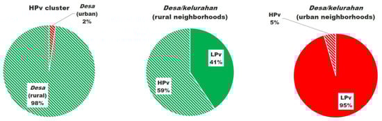 In 2018, the mean poverty (poor households) rate of the desa/kelurahan in the HPV cluster reached 29.5% of the total households, while in the LPv cluster, only 8.6%. In total, 87 out of 187 desa/kelurahan (46.5%) were included in the HPv cluster, with the remainder belonging to the LPv cluster. Then, 98% of the members of the HPv cluster are rural neighborhoods; only two desa/kelurahan (urban neighborhoods) are within the HPv cluster (Figure 7). More than half (59%) of desa/kelurahan (rural neighborhoods) fall within the HPv cluster, while only 5% of desa/kelurahan (urban neighborhoods) fall within the HPv cluster (Figure 7).