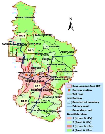 The investigation was divided into two sections: (1) delimitation of urban and rural neighborhoods of the Bekasi Regency and their characteristics, and (2) urban and rural neighborhoods’ economic disparities in the Bekasi Regency and their characteristics. Together with the development of spatial analysis methods and techniques, this paper discusses development issues by utilizing spatial analysis combined with spatial statistics (quantitative zoning method) at the microregional level (desa/kelurahan). In the case of the Bekasi Regency, analysis at the microregional level is needed because its development is dynamic and scattered [15,20,39].