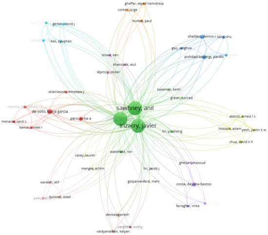 VOSviewer mapping of big data management algorithms, deep learning-based object detection technologies, and geospatial simulation and sensor fusion tools in the Internet of Robotic Things regarding co-authorship.