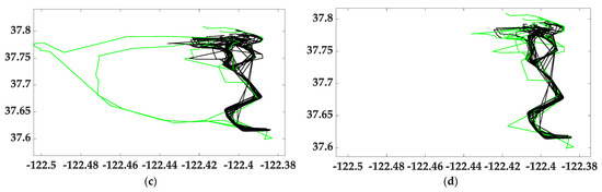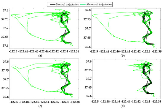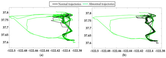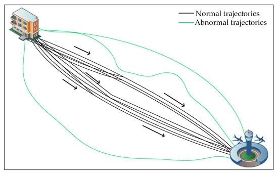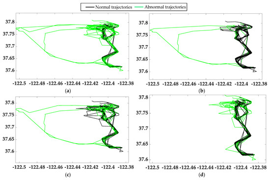 Trajectory analysis research is important in urban transportation system research. It primarily includes trajectory clustering, data classification, data mining, and abnormality detection [10]. This study focuses on the detection of abnormal trajectories. A trajectory that deviates from the norm spatially, or in terms of distance, is considered abnormal. On the contrary, trajectories that are short in space or distance or similar to the absolute majority of trajectories are considered normal. As shown in Figure 1, the green trajectories are abnormal trajectories, and the black trajectories are normal trajectories. Researchers have proposed several abnormality-detection algorithms, such as clustering- [11], path selection probability- [12], and road network division-based methods [13]. However, most studies determine abnormalities based only on the distinctive feature of “few and different” abnormal trajectories, ignoring that drivers choose “abnormal” driving routes based on their driving experience, which are not necessarily abnormal trajectories. This study aims to accurately determine abnormal trajectories. Trajectory abnormality-detection methods can be classified as classification-, distance-, historical similarity-, and grid-based methods.