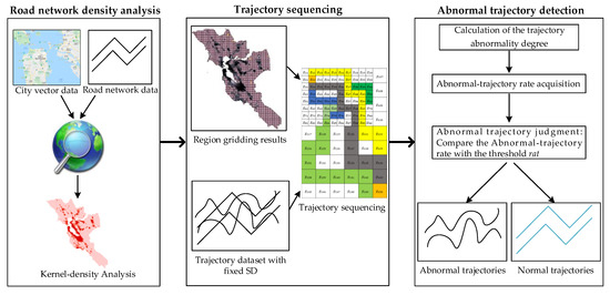 The abnormality-detection based on variable grid (ATDVG) method proposed in this study includes three stages: road network density analysis, trajectory sequencing, and abnormal-trajectory detection. The road network density analysis and trajectory sequencing belong to the pre-processing stage before abnormal-trajectory detection. Figure 2 illustrates the working mode of the method.