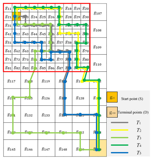 As indicated in Table 3, where NSG = 20, = 13, and = 7, the number of grids and grid codes corresponding to the high- and low-density road network regions in the example in Figure 4 are determined by Algorithm 2. As shown in Figure 4 and Table 3, the detours mostly occur in the high-density road network regions, and is the benchmark trajectory. The degree of abnormality of each trajectory was calculated separately according to , and the calculation results are listed in Table 4.