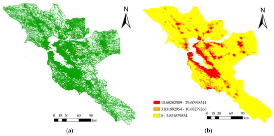 Kernel density analysis: (a) San Francisco Bay region road network; (b) Results of kernel density analysis.