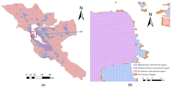 As shown in Figure 5a, the spatial distribution of the road networks in San Francisco is uneven, with the inner ring region having the highest road network density, followed by the inner and outer ring junction regions and outer ring region. In the kernel density analysis, the size of the lattice element should be smaller than the minimum grid size in the experiment. Referring to previous studies [25,26], the smallest grid size in our experiments was set as 350 m × 350 m. Combined with the kernel density analysis results, the lattice element size was set as 100 m × 100 m, and the city of San Francisco was divided into three regions, as shown in Figure 5b, where red indicates the denser region of the road network (grid image kernel density is 10.68–29.61), orange and yellow indicate the slightly dense region (grid image kernel density is 3.83–10.68) and the sparse region of the road network (grid image kernel density is 0–3.83), respectively.