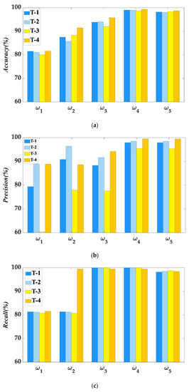 In this study, five parameters ( = , , ) were analyzed, where , as shown in Equation (15). The different parameter settings on the T-1 dataset were tested separately, and the highest values of Accuracy, Precision, and Recall were obtained for rat = 0.106 under each group of parameters. The experimental results of T-1, T-2, T-3, and T-4 under each group of parameter conditions are shown in Figure 10.