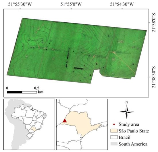Location of the study area in the western region of the state of São Paulo, Brazil, and the UAV orthomosaic (true colour composite red-green-blue (RGB):321) of the study area in August 2019.