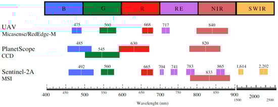 Spectral (bandwidth and central wavelength) characteristics of UAV orthomosaic, PlanetScope, and Sentinel-2A imagery.
