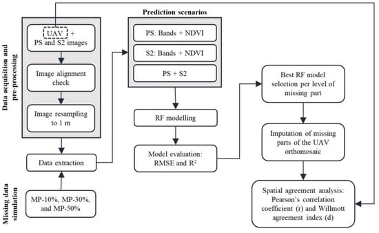 The recent advances in unmanned aerial vehicle (UAV)-based remote sensing systems have broadened the remote sensing applications for agriculture. Despite the great possibilities of using UAVs to monitor agricultural fields, specific problems related to missing parts in UAV orthomosaics due to drone flight restrictions are common in agricultural monitoring, especially in large areas. In this study, we propose a methodological framework to impute missing parts of UAV orthomosaics using PlanetScope (PS) and Sentinel-2 (S2) data and the random forest (RF) algorithm of an integrated crop–livestock system (ICLS) covered by grass at the time. We validated the proposed framework by simulating and imputing artificial missing parts in a UAV orthomosaic and then comparing the original data with the model predictions. Spectral bands and the normalized difference vegetation index (NDVI) derived from PS, as well as S2 images (separately and combined), were used as predictor variables of the UAV spectral bands and NDVI in developing the RF-based imputation models. The proposed framework produces highly accurate results (RMSE = 6.77–17.33%) with a computationally efficient and robust machine-learning algorithm that leverages the wealth of empirical information present in optical satellite imagery (PS and S2) to impute up to 50% of missing parts in a UAV orthomosaic.