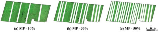The parallel path planning system commonly adopted to collect UAV images combined with unexpected flight situations (such as sudden wind gusts) may affect the perfect overlap of the images, resulting in missing parts in the UAV orthomosaic in the shape of strips. Thus, we simulated three levels of artificial missing parts in the UAV orthomosaic in strips, corresponding to gaps of 10% (MP-10%), 30% (MP-30%), and 50% (MP-50%) of the orthomosaic total area (Figure 4). Considering the missing part levels and the 220,000 points (original sample), we defined the training and testing datasets for data modelling. From the selected 220,000 points, those not matching the missing parts of the UAV orthomosaic were used to train the imputation models, i.e., 198,000 points for MP-10%, 154,000 points for MP-30%, and 110,000 points for MP-50%. The points matching the missing parts of MP-10%, that is, the same 22,000 points were used in the testing dataset for the performance evaluation of all three levels of missing parts (MP-10%, MP-30%, and MP-50%).