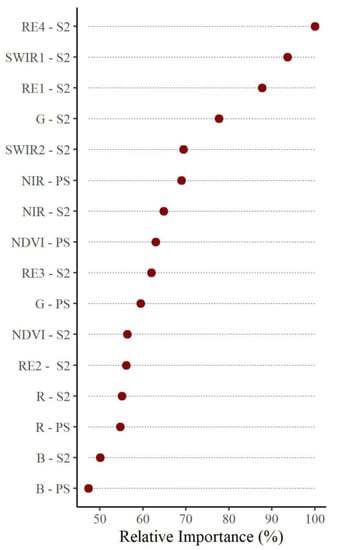 The RE4, SWIR1, RE1, G, and SWIR2 spectral bands from the S2 image were the five most important variables (Figure 5) in imputing the missing parts in the UAV orthomosaic. They were measured according to the overall relative importance of the predictor variables, as measured by the variable importance metric in the eighteen RF-based imputation models using both PS and S2 data.