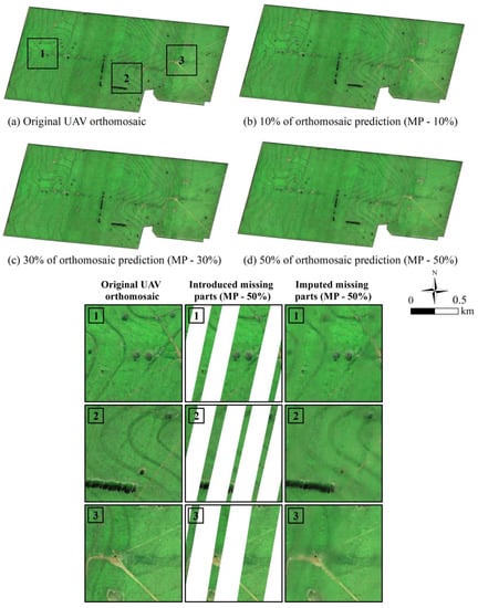 The plot of true colour composites (RGB:321) of the original UAV orthomosaic and imputed UAV orthomosaic for the three levels of missing parts for a visual inspection of the prediction performance of the proposed framework is shown in Figure 6. We also selected three regions (squares #1, #2, and #3 in Figure 6) within the image to show in more detail the UAV orthomosaic imputed parts in the highest level of missing parts assessed in this study (MP–50%). We observed that the RF-based imputation models could reconstruct abrupt changes in the image, such as sparse trees (squares #1 and #2), tree rows (square #2), paddock divisions (square #3), and terrace edges present in the grass-dominated vegetation (squares #1, #2, and #3).