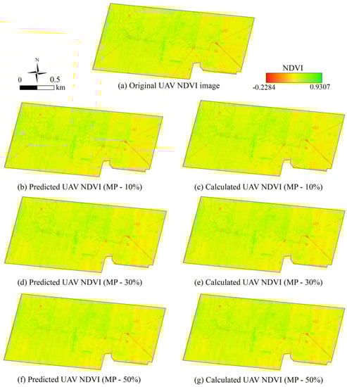 Original UAV NDVI image (a); predicted NDVI images with missing parts of 10% (b), 30% (d), and 50% (f); and the calculated NDVI images (based on the imputed R and NIR spectral bands) with missing parts of 10% (c), 30% (e), and 50% (g).
