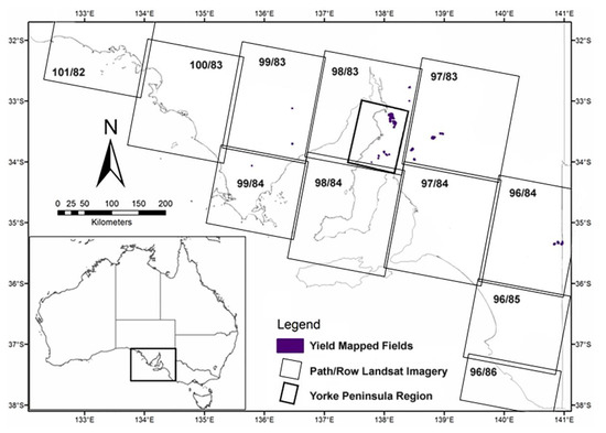 The existence of geographic variation in crop yield is well known to growers and land managers, and its management through variation in inputs has been well recognised in the agricultural world through the concept of precision agriculture [36,37]. Yield mapping of fields at a high spatial resolution has become an integral component of precision agriculture [38] and modern farm management. It represents an important source of geo-information on the spatial and temporal variation in crop yield in order to delineate management zones [39,40]. Yield mapping of information over time can highlight areas of low productivity where different land uses may be undertaken and, perhaps more importantly, highlight where not to change land use in areas where yield and financial returns are consistently high over time [41]. These land use strategies can maximise productivity at the field scale and profitability at the farm scale. Although yield mapping has been steadily adopted over time [42], a time lag does exist to make informed decisions on crop management, as it may take numerous years of data collection to produce a reliable evidence base. Additionally, there are cases in which growers do not adopt yield mapping at all but wish to understand their farm’s spatial and temporal variation in crop yield. To circumvent these issues, researchers have attempted to create high-resolution estimates of wheat yield across a region over time, retrospectively incorporating the high-resolution benefit of yield mapping and the broad extent of satellite imagery to go beyond the farm boundary [43,44]. More recently, with the advent of access to free high-resolution imagery and a growing archive of yield-mapped fields across time and locations, there has been a further recognition of the benefit of using such geo-information to create high-resolution estimates of yield across regions [45,46]. Yield mapping data has been included in training and validation processes to compare different modelling approaches and develop an improved understanding of the use of remote sensing imagery in regional yield estimation [47,48,49]. A criticism of these studies is that the created empirical models are based on the calibration and validation of data specific to an area that represents localised growing conditions and thus cannot easily be extended to other larger areas [49]. Furthermore, while the number of field years analysed has grown, within the literature there are still limitations to the number of years investigated [47] and to the spatial relevance of the developed relationships to other areas due to the reliance of yield mapping from a small number of farms [46]. To make these strategic management and longer-term land use decisions, land holders need information of high spatial precision across large extents so that they can consider changes in current management practices and land use based upon past, current and future productivity. Whereas current patterns of yield are more readily available through newer imagery and yield mapping datasets, a comprehensive archive of information is rare but critically important. Such an archive forms a foundation for longer-term analysis of spatial and temporal differences in seasonal yield. Using data from 1999, which is thought to be near the start of yield mapping in the region under study, this research contributes to the long-term archive of agricultural data, which is increasingly important for contemporary on-farm and future land use decision making. Given the potential of the creation of yield predictions from yield mapping and satellite imagery in the Australian Mediterranean cropping area [43,44], we explored the ability of approaches to move beyond the farm boundary utilising yield mapping data from multiple farms and imagery taken over time, as well as in multiple regions. Therefore, the aim of this paper is to address the operationalisation issues of creating high-resolution yield estimates across the South Australian dryland cereal cropping region. This operationalisation requires evaluation of the ability to create robust models that predict yield based on the relationship between yield measured by yield mapping technology and biomass values estimated from Landsat satellite imagery. Once these models are created, we must be able to extrapolate them accurately by discriminating crop types at the field level using Landsat sensors. Thus, the objective of this study is to evaluate the sensitivity of yield prediction and crop discrimination accuracy over an eight-year time series in a large agricultural area on the Yorke Peninsula. We then expand the extent of the analysis to investigate the appropriateness of this methodology across all dryland cereal cropping regions in South Australia for three years of analysis. Given that operationalisation issues are expected to be encountered in extending the methodology elsewhere, we test whether crop discrimination and the regular annual collection of yield data are necessary by evaluating the accuracy of more generalised yield prediction models.