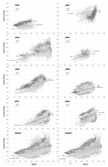 Wheat and barley yield vs. NDVI scatter graphs and fitted empirical power models for the eight years in the YPA and the two global models (Global* excludes the 2001 wheat yield and NDVI data).