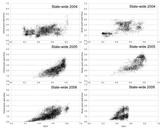 Our second objective was to test the spatial generalisability of the proposed methodology to the state-wide agricultural region. We achieved reasonable results for prediction of yield across the state, with the annual crop-specific models producing the best results, whereas pooling of the crop types once again produced slightly higher RMSE results. This is encouraging, given that we utilised yield data from geographically disperse farms across the state and single satellite images across different time periods for the period of August to September. However, this snapshot approach of stitching together different imagery dates does produce application issues. For example, the distribution of the yield-to-NDVI relationship for barley (Figure 3) developed across different dates of imagery for 2004, highlighting that different relationships do exist across the state. This is caused by geographic differences in climate–soil interactions in the same growing period and year. This reinforces our previous proposal that better techniques may be available to create these state-wide estimates.