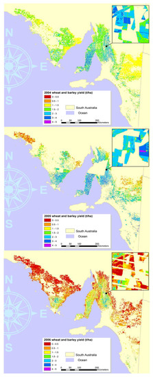 Figure 4 shows an example of the predicted yield from the extrapolated empirical models for the state-wide analysis for 2004 to 2006. Broad trends in yield variation can be seen across the state; the insets within the maps show the spatial pattern of yield within and across fields due to the high resolution of the data used. For 2004, yield varied from 1.0–4.0 t/ha, with higher yield estimates clustered in the YPA study region. A defined line through the eastern side of the image shows yield differences caused by the mosaicking of different image dates, which were 25 days apart due to cloud cover. Yield estimates for 2005 showed greater yield variation, with values ranging between 0.5 and 5.0 t/ha. A major proportion of the middle of the 2005 state-wide image was removed due to extensive cloud cover. The inset shows the high degree of spatial variation of yield, with some fields with yields varying from 1.5 to 4.0 t/ha within their boundaries. Finally, yield estimates for 2006 showed that a significant part of the state had predicted yields of less than 1.0 t/ha. Yield did vary with this season, with some fields within the inset having predictions of between 0.5 and 3.0 t/ha within their boundaries. Also apparent in this inset is the interleaving of missing values caused by the scan line problem associated with the Landsat ETM+ sensor after July 2003.