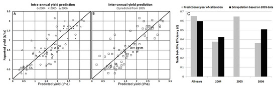(A) Scatter plot of regional yields predicted from yield–NDVI models versus yields reported at the administrative region level for 2004, 2005 and 2006. (B) Scatter plot of yields predicted from Landsat NDVI images from 2004, 2005 and 2006 from the yield–NDVI relationship developed in 2005 versus reported yields at the administrative region level. Each data point represents predicted versus reported yield for one administrative region. (C) Nash–Sutcliffe efficiency criterion (E) for annual, interannual and all-years yield prediction models.