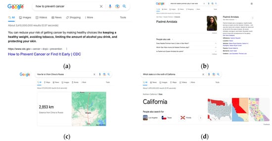 Open-domain QA examples. The questions in (a,b) are about general knowledge, and (c,d) are about geographic domains. (a) Example of TextQA regarding general knowledge; (b) example of KBQA regarding general knowledge. (c,d) Simple questions that Google QA fails regarding geographic domains: (c) distance between adjacent countries (answer should be 0 or adjacent); (d) question about cardinal direction. This case study demonstrates that even Google QA fails at simple geographic questions that require simple geographic domain knowledge.