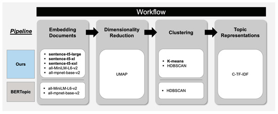 Workflow of our approach. Our approach shares the same pipeline with BERTopic. However, our approach has more options for choosing the models.