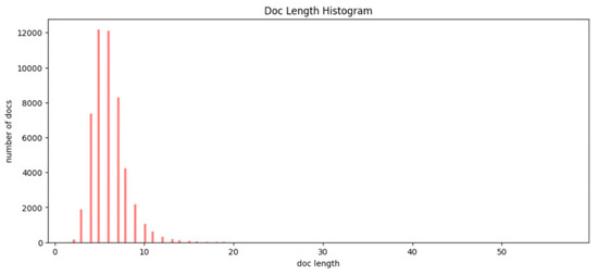 Histogram of document lengths. The X-axis represents the question (document) length, which is the number of words in each question. The Y-axis represents the number of questions with the specific value of question length. Most of the questions have a length between 4 and 8 words.