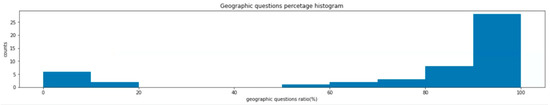 GeoQuestions201 and GeoAnQu are small dataset made up of subjective, uncommon questions among public users, respectively. Therefore, there is no guarantee that the questions in [4,5] could represent a “natural” distribution of the information needs that users may want to satisfy using an intelligent assistant. As QA’s fundamental role is to answer users’ queries, a practical QA engine must be improved to satisfy the user’s request. In conclusion, the MS MARCO dataset would be a good fit for GeoQA tasks, as it comprises questions that were sourced from a real-world question-answering engine.